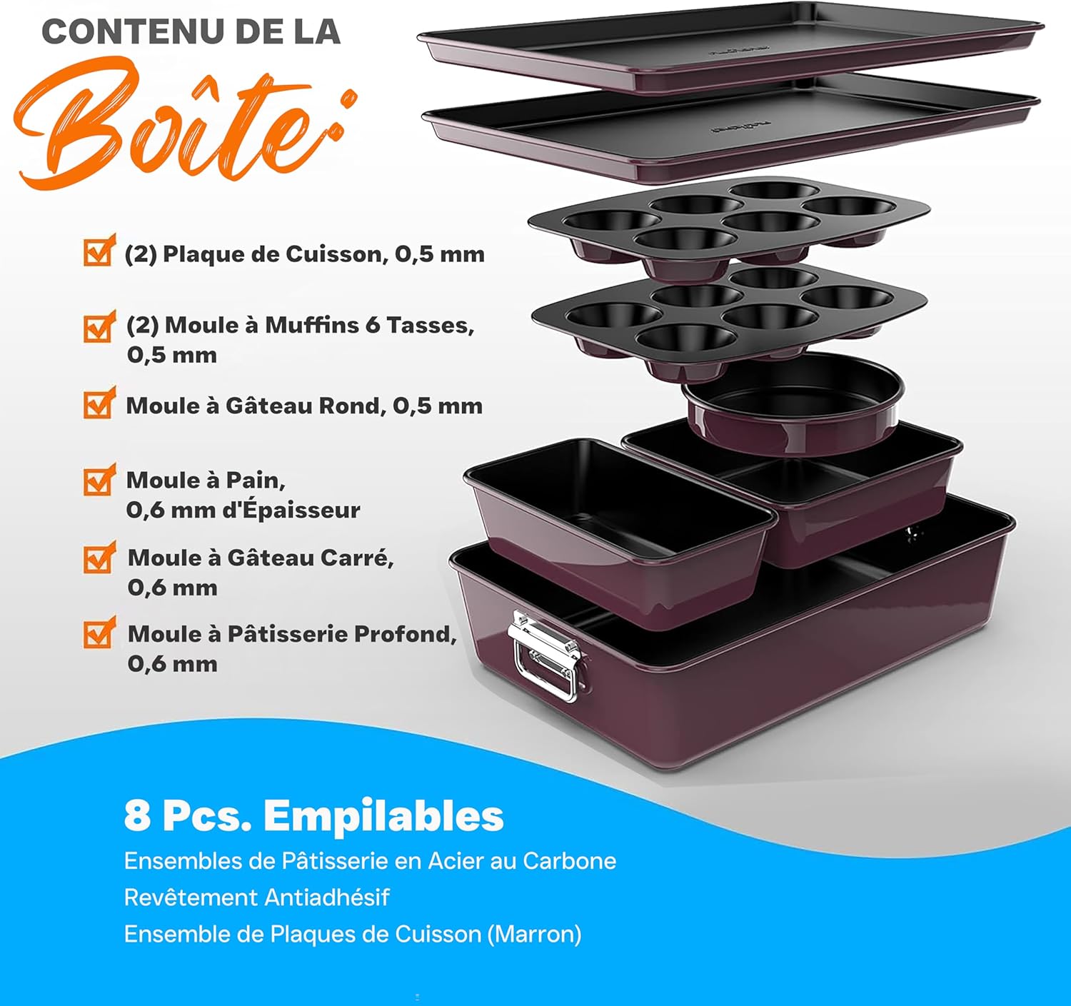 Ensemble complet de 8 pièces : Ce kit de moules à pâtisserie comprend 2 plaques de cuisson, 2 moules à muffins de 6 cavités, 1 moule à gâteau rond, 1 moule à pain, 1 moule à cake et 1 moule profond, parfait pour préparer de grandes quantités de gourmandises maison.